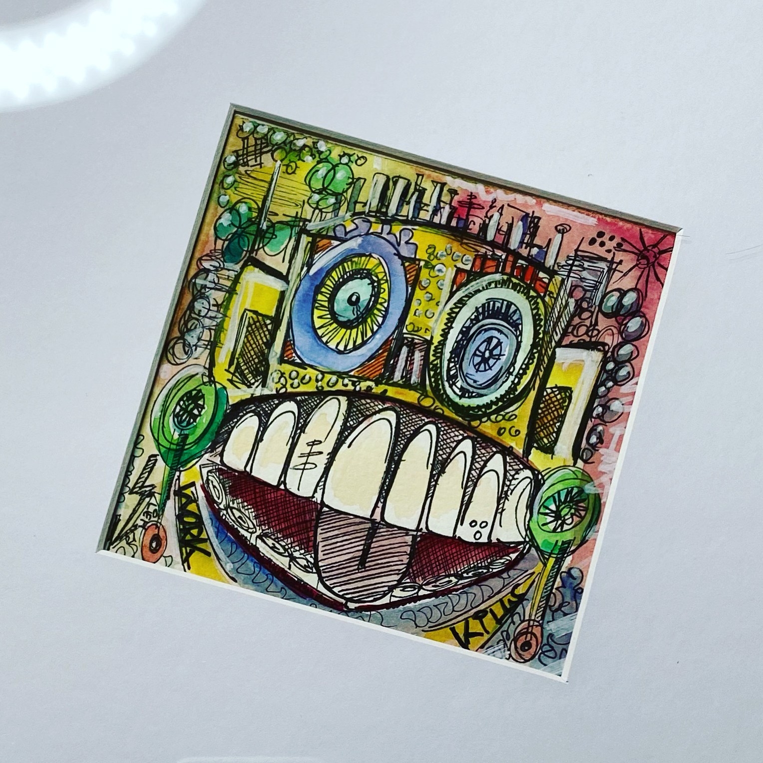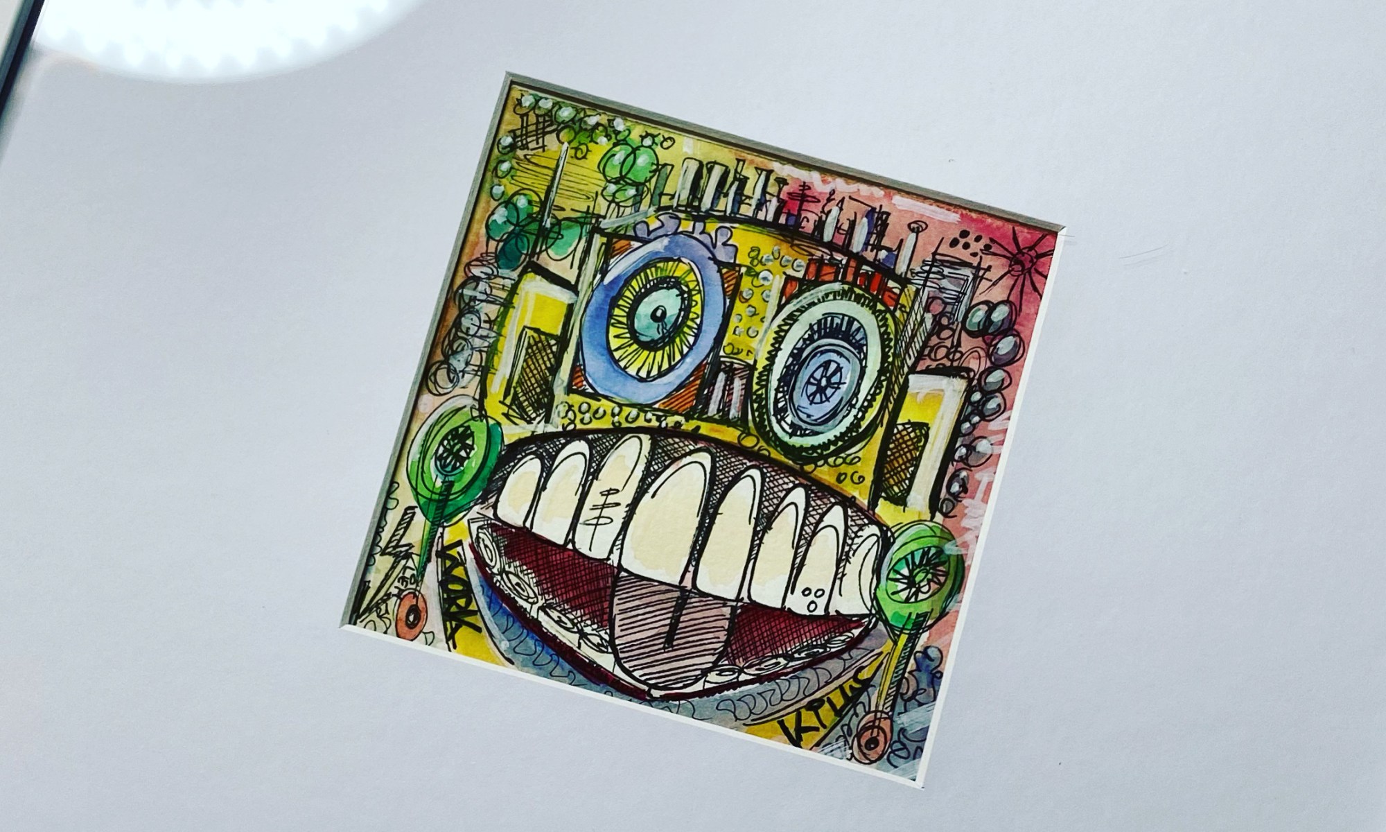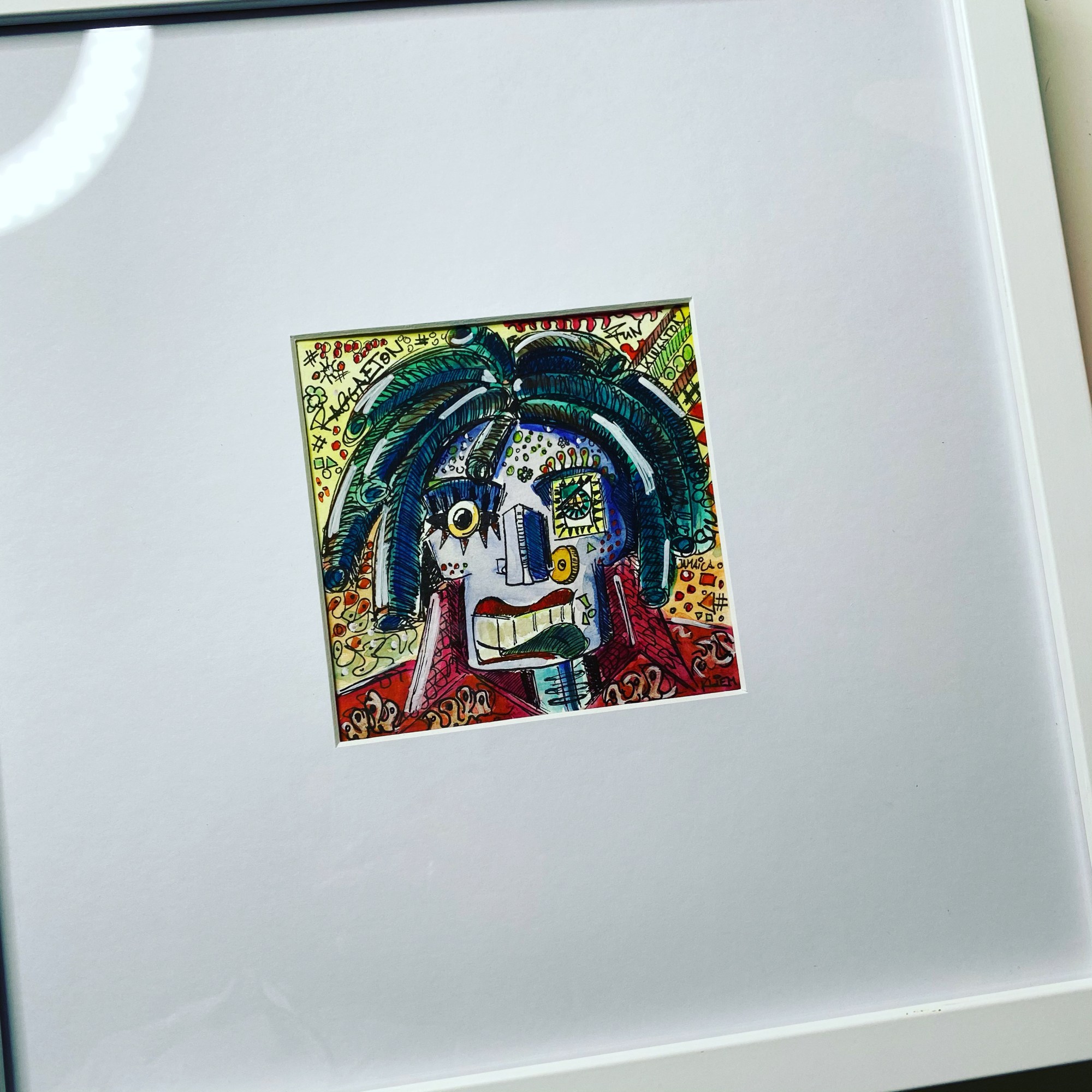 Elf auf elf Zentimeter Wasserfarbe und Marker auf 300g/m² coldpress Aquarellpapier, hinter weißem Passepartout-Karton, im weißen 33x33cm Holzrahmen. Direkt gemalt, was einem gerade im Kopf ist. Gedanke steuert Hand. Fantasie führt Farbpinsel.