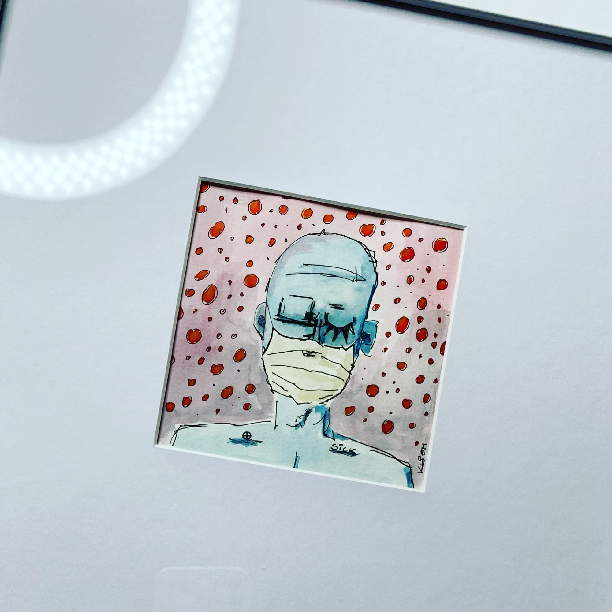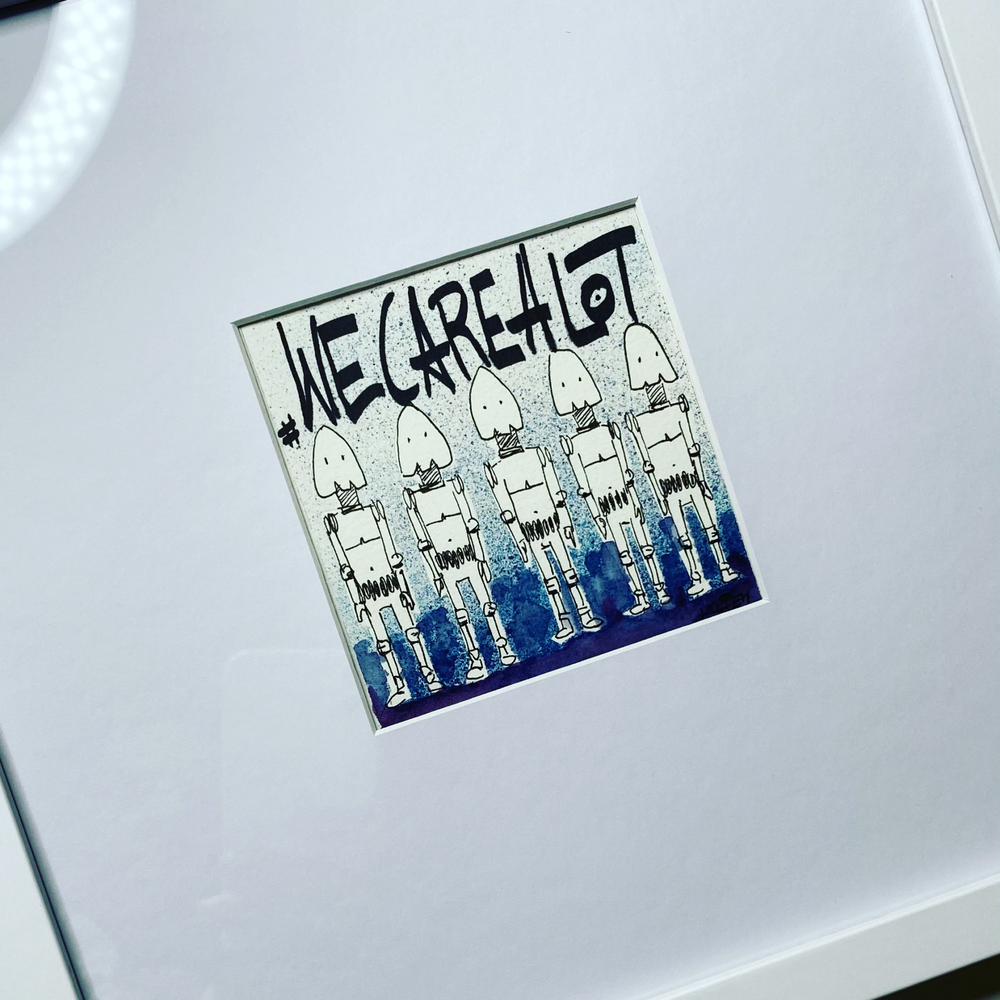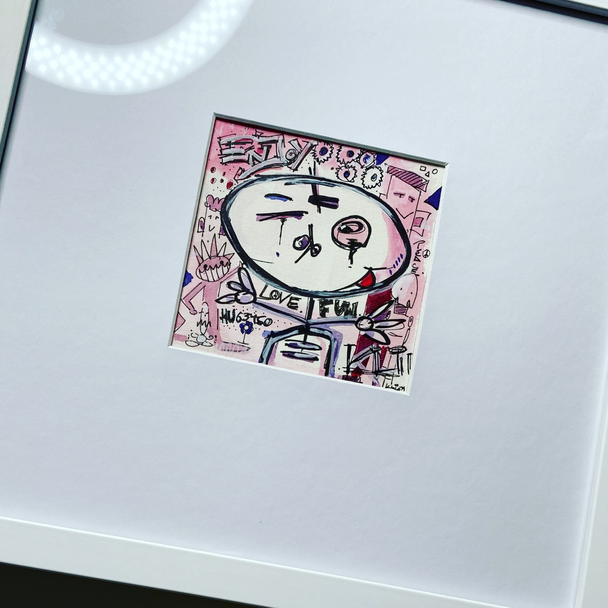 Elf auf elf Zentimeter Wasserfarbe und Marker auf 300g/m² coldpress Aquarellpapier, hinter weißem Passepartout-Karton, im weißen 33x33cm Holzrahmen. Direkt gemalt, was einem gerade im Kopf ist. Gedanke steuert Hand. Fantasie führt Farbpinsel.