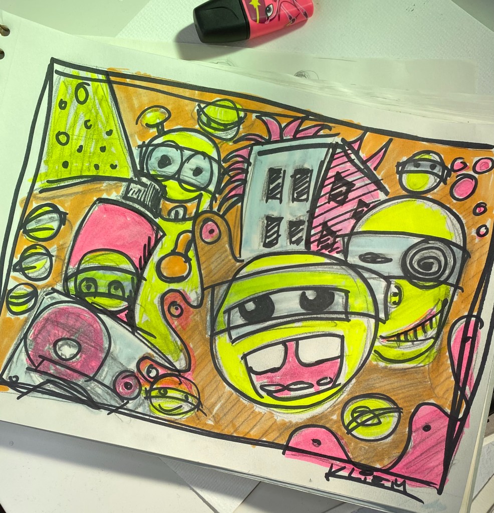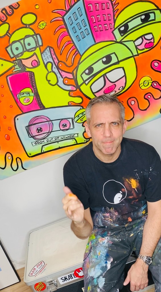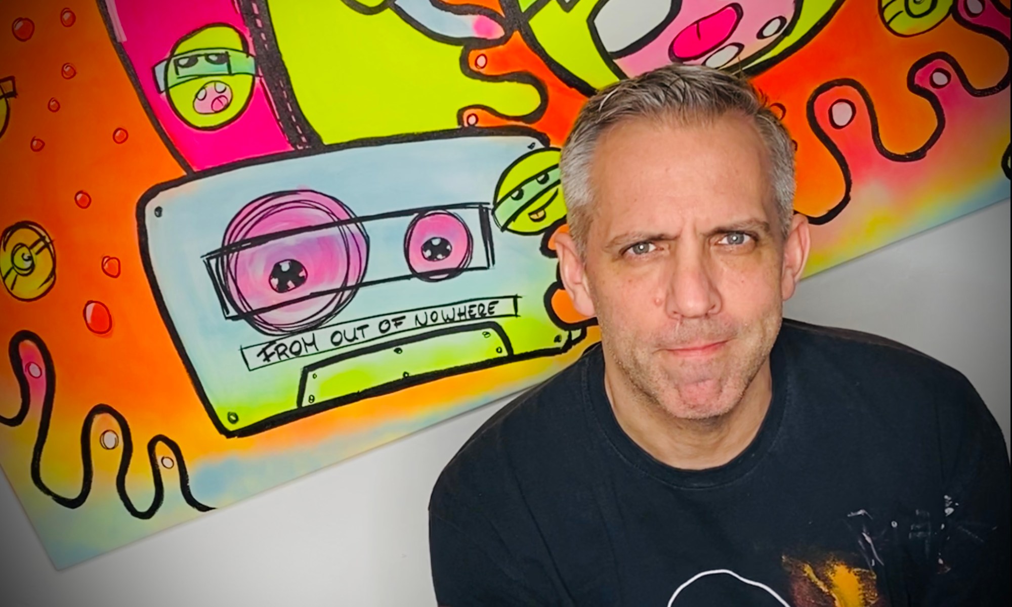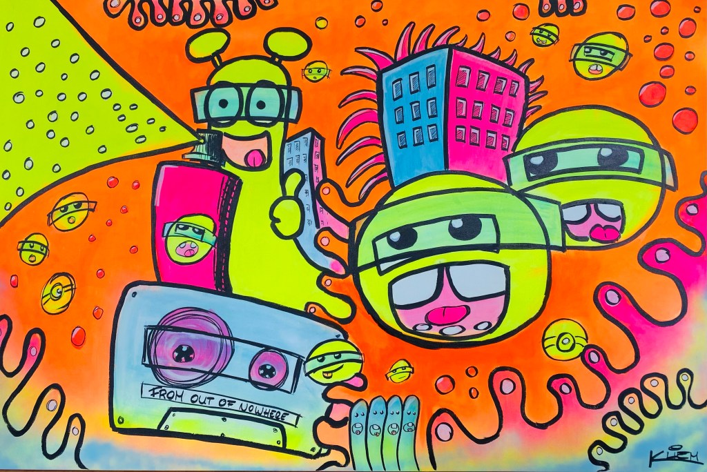 Also rein mit der CD und den Volume-Regler meines über 30 Jahre alten JVC-Verstärkers aufgedreht. Neben Hits wie „Epic“, „We care a lot“ oder „Falling to Pieces“ droschen Mike Patton und seine Jungs auch mein altes Lieblingslied „From out of Nowhere“ durch die Röhre. Das ist es, dachte ich. Auf dem Bild hatte ich eine große Kassette gemalt. Und die brauchte einen Titel. Ich hatte ihn. From out of Nowhere. Wie aus dem Nichts fliegen ja auch die Emojis und die Spray-Wolke des neongelben Graffiti-Monsters über das Bild.