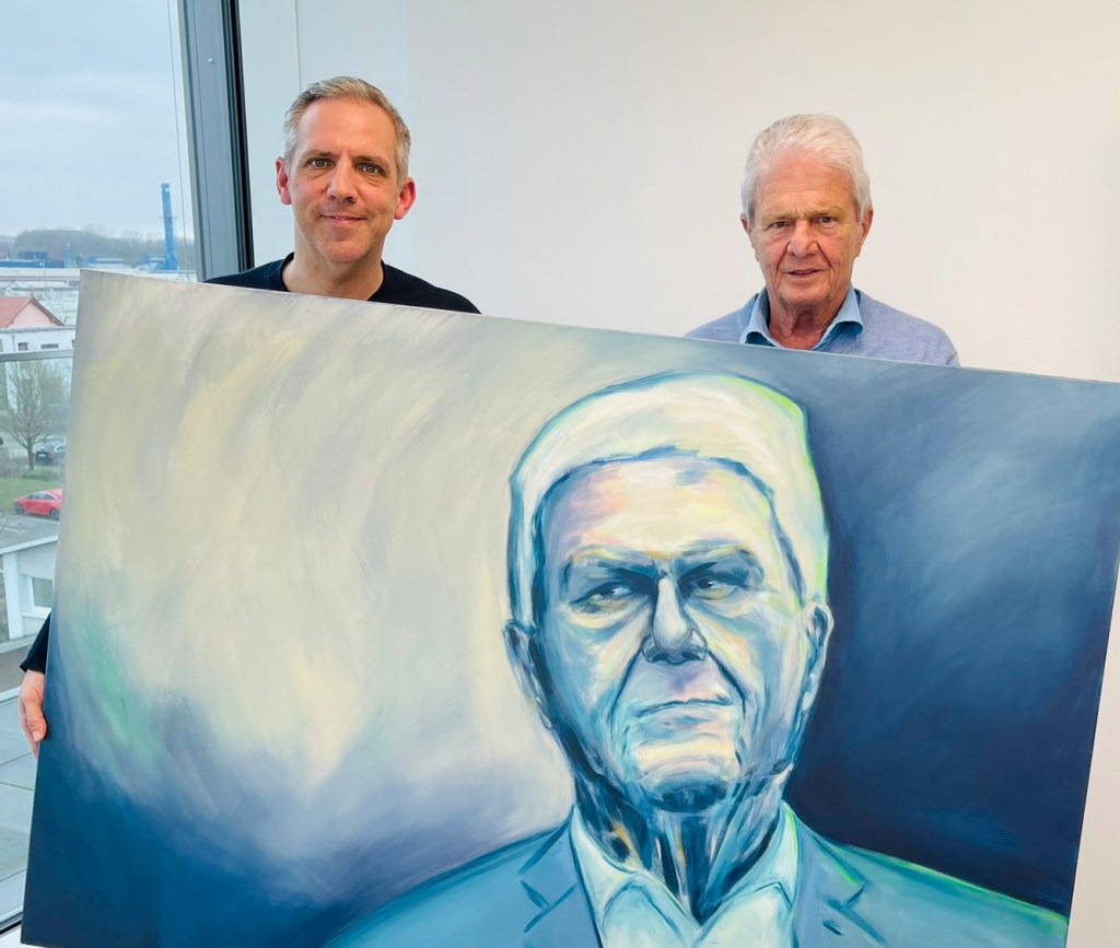 Dietmar Hopp in den Farben des Fußball-Bundesligisten TSG Hoffenheim. Blau-weiße Acryltöne auf einer 1,5 Meter breiten Leinwand. Ein Bild des Hanauers Holger Kliem wurde jetzt als Geschenk an seinen neuen Besitzer übergeben: SAP-Gründer und TSG-Gesellschafter Dietmar Hopp.