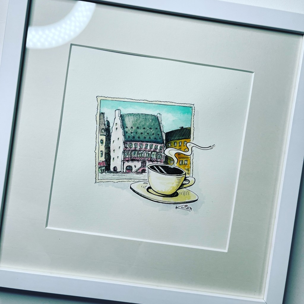 Umso glücklicher bin ich, dass nun drei meiner Bilder im „Brasini“ hängen und den Gästen beim Kaffee-Genuss hoffentlich Spaß machen. Es sind drei Hanauer Motive, die ich mit dem Thema „Kaffee und Kuchen“ in Verbindung gebracht habe.