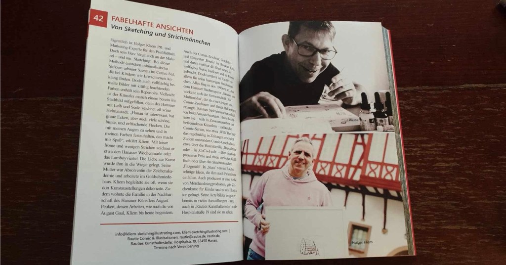 Was allerdings erstaunlich ist, auch ich komme darin vor. Zwei Seiten sind mir und dem bekannten und erfolgreichen Hanauer Comiczeichner Rauti gewidmet. Ein Vergleich, der eigentlich nicht statthaft ist. Zu unterschiedlich ist das Niveau. Rauti ist seit Jahrzehnten mit seinen Comics und seinen Illustrationen ein preisgekrönter Künstler, der weit über die Grenzen der Stadt bekannt ist. Umso mehr ehrt mich die Auswahl der Buchautoren.